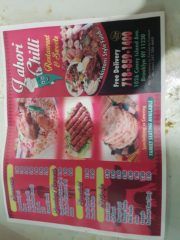 Located in Brooklyn, NY, Lahori Chilli Restaurant & Sweets offers a diverse menu of Halal dishes with a focus on Pakistani cuisine. From flavorful rice dishes like Lamb Chomps over Rice to vegetarian options like Aloo Gobi and Chickpeas, there is something for everyone. The restaurant also boasts unique offerings such as Butter Cheese (Paneer Makhni) and Chicken Korma. With a casual and intimate atmosphere, Lahori Chilli is perfect for a cozy dinner or a group gathering. The restaurant provides a range of amenities including delivery, takeout, and catering services, making it convenient for all occasions. Whether you're looking for a quick lunch or a leisurely dinner, Lahori Chilli's delectable dishes and warm ambiance will surely satisfy your cravings.